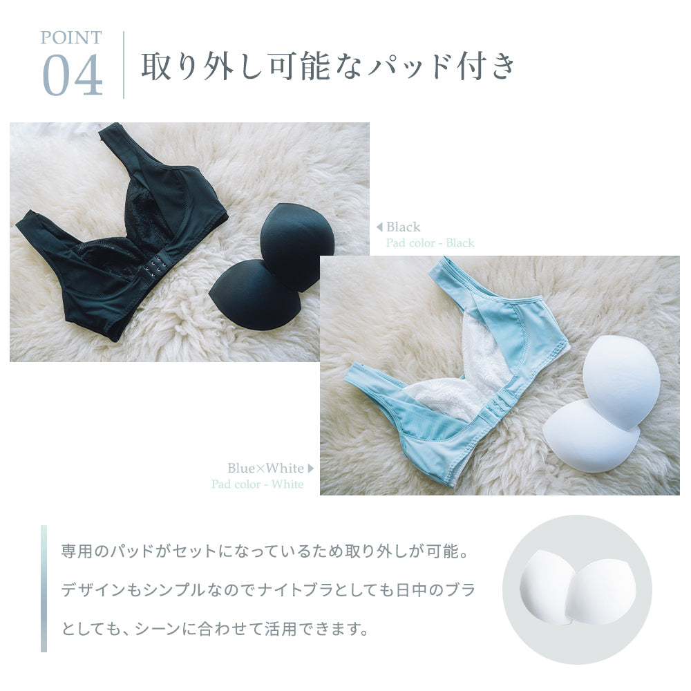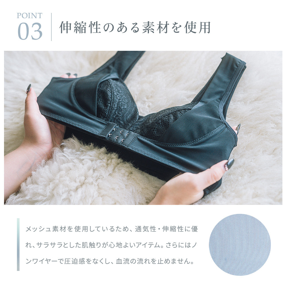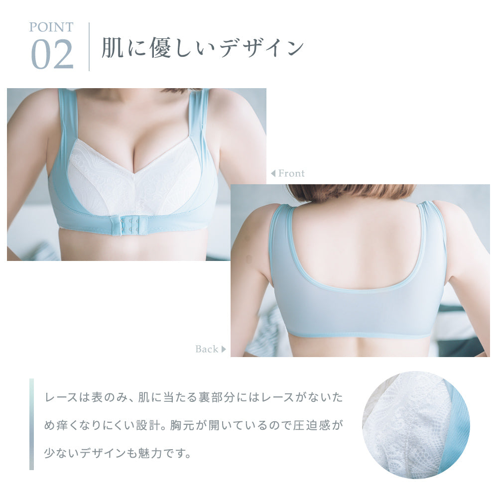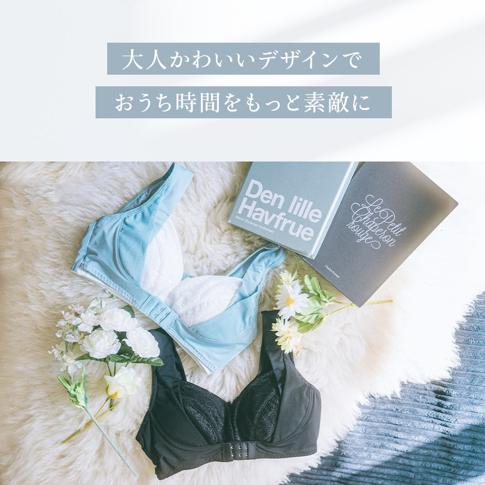 くすみカラーが大人かわいい、ブラックとブルーの2色展開で、胸元のレースがランジェリー感を出します。おうち時間をもっと素敵に過ごせるデザインです。前ホックがあるのも嬉しいポイント