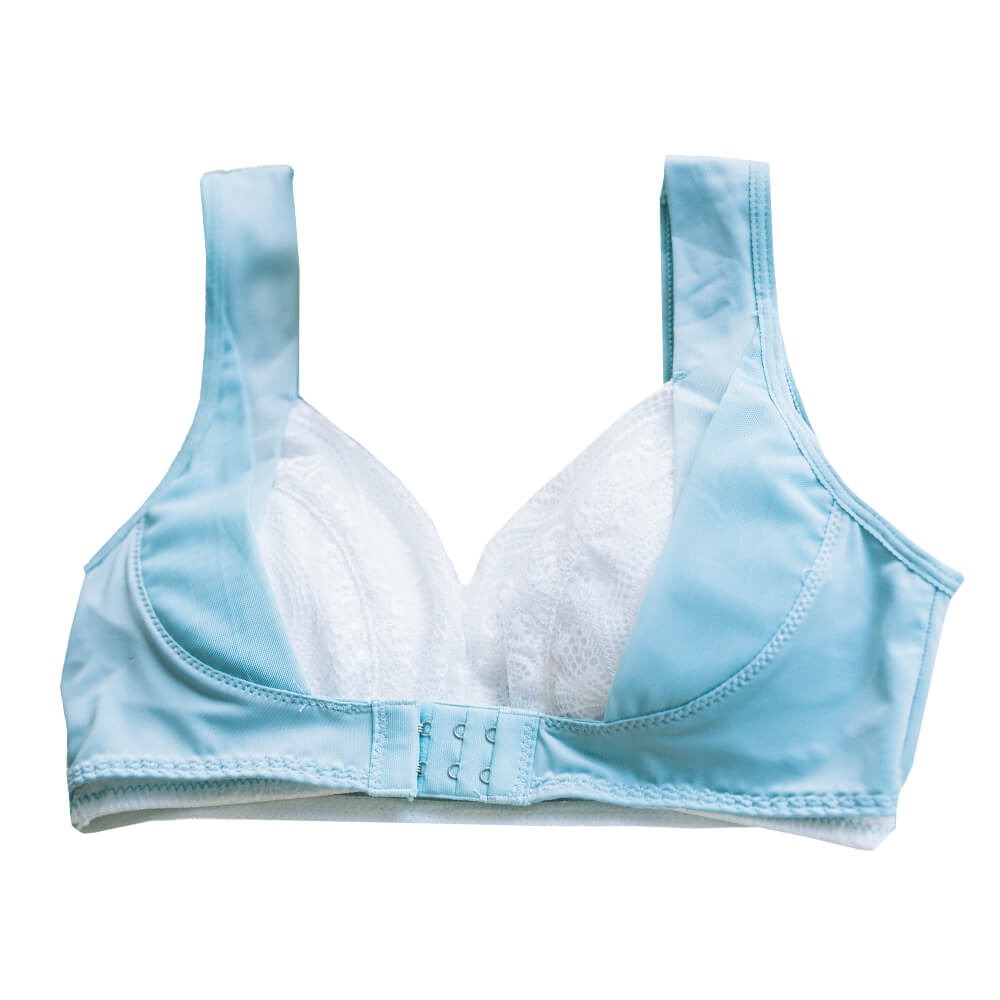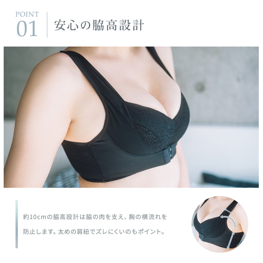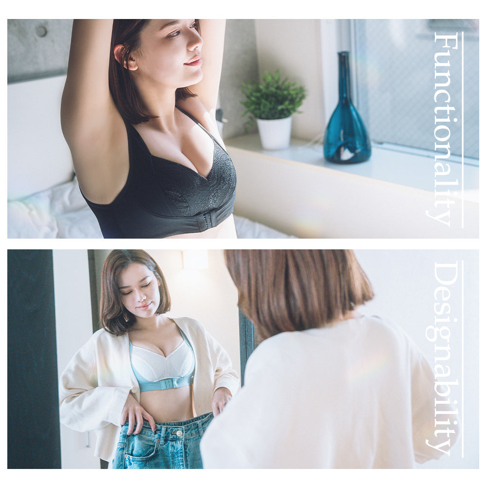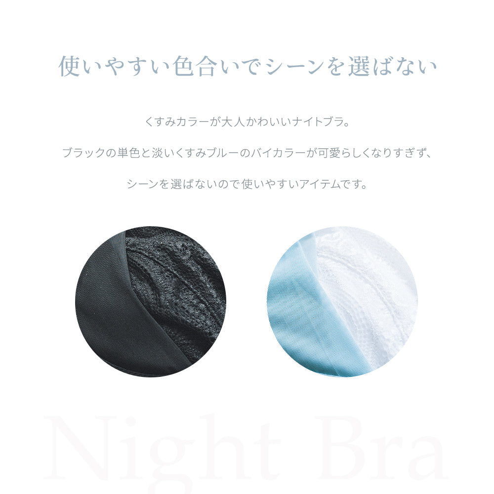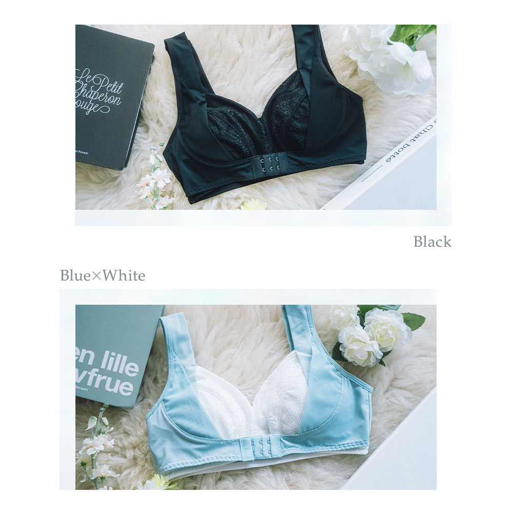 くすみカラーが大人かわいい、ブラックとブルーの2色展開で、胸元のレースがランジェリー感を出します。おうち時間をもっと素敵に過ごせるデザインです。前ホックがあるのも嬉しいポイント