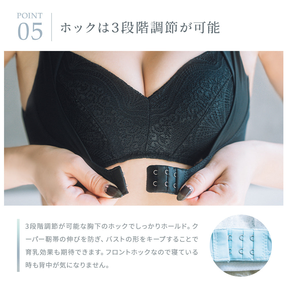 ホックは3段階調整が可能で胸下でしっかりホールドします。バストの形をキープすることで育乳効果も期待できます。