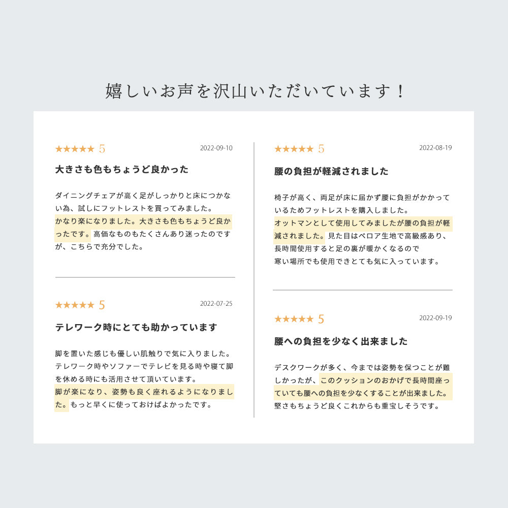 MyComfort(マイコンフォート)では商品開発チームと幾度にもわたって商品改良を行い、ようやく皆様に満足いただけるフットレスト(足置き)に仕上げることができました。「色合い」・「素材感」・「硬さ」・「サイズ」と重要な要素を徹底的に考え抜き、製品化にたどり着いた MyComfort プレミアム フットレスト を今すぐ実感してください。